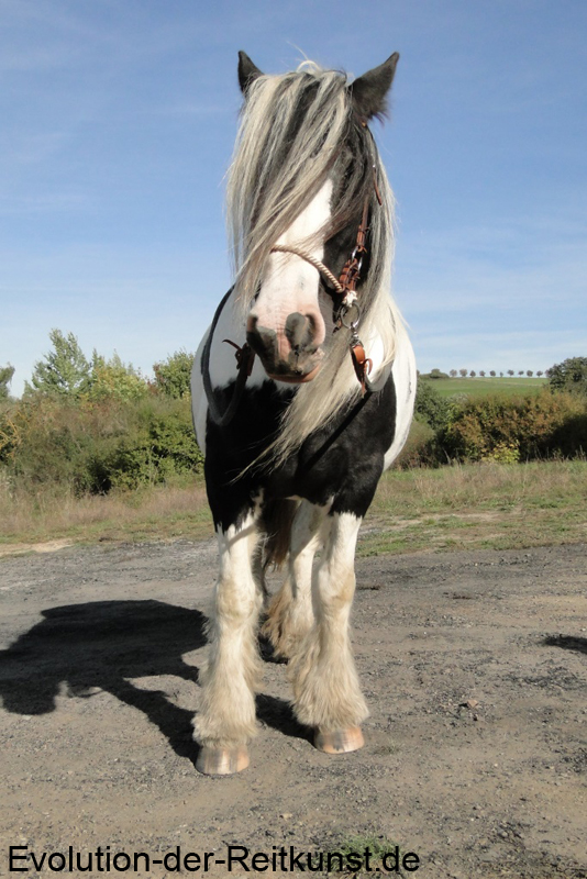 Die Schiefe des Pferdes zeigt sich auch an den Hufen. Oben hatte ich bereits die Ausrichtung des Hufes angesprochen, der leicht in Richtung der händigen Seite zeigt. Hat das Pferd darüber hinaus die Tendenz, zehenweit zu stehen, also mit leicht nach außen gedrehten Hufen, wird sich dies auf der händigen Seite stärker zeigen. Umgekehrt wird sich der händige Vorderhuf bei einem zehenengen Pferd, wo die Hufe nach innen gedreht sind, mehr nach innen drehen als der andere Vorderhuf. Die Form der Hufe oder auftretende Probleme wie Hornspalten geben weitere Hinweise auf eine bestehende natürliche Schiefe. Der Vorderhuf der händigen Seite ist oftmals etwas breiter und flacher als der Vorderhuf der hohlen Seite, denn ersterer trägt mehr Gewicht. Nutzer von Hufschuhen merken das daran, dass sie für beide Hufe unterschiedliche Größen kaufen müssen oder ein Schuh besser sitzt als der andere. In Extremfällen kann sich der Vorderhuf der hohlen Seite über die Zeit in Kombination mit schlechtem Training auch in Richtung Bockhuf entwickeln. Beim Huf des händigen Vorderbeins besteht wegen der stärkeren Belastung hingegen ein höheres Risiko für die Entstehung von Hornspalten und Rissen.